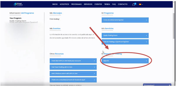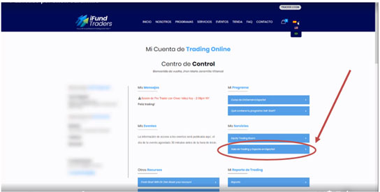 Ingresas a www.ifundtraders.com y allí vas a la esquina superior derecha como se indica en la imagen, digitas tu usuario y contraseña, te diriges a la sección “mi reporte de trading” das clic en “mi reporte” como se indica en la imagen