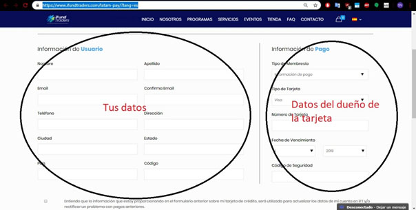 Si, sin problema, pero ten en cuenta que debes registrar tus datos de esta manera (como se muestra en la imagen) para que podamos detectar que el pago corresponde a tu plataforma, no olvides colocar el correo con el que estas registrado en iFundTraders en el “e-mail” de la información del usuario.