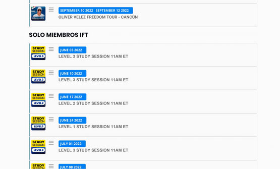 Ingresas a https://www.ifundtraders.com vas a la pestaña “eventos”, y bajas hasta la parte donde encuentras “solo miembros iFT” allí encontraras las sesiones a las que tienes acceso según el programa al que perteneces.